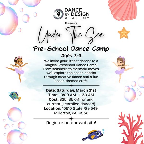On Saturday, March 21st, we invite your littlest dancer, ages 3-5, to a magical Preschool Dance Camp! From seashells to mermaid moves, we'll explore the ocean depths through creative dance and a fun ocean-themed craft. Registration is now open. Click below to learn more!